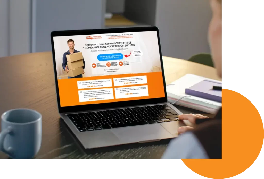 Lorsque les gens visitent notre site web, en plus d’obtenir toutes sortes d’informations pertinentes sur les services de déménageurs, ils sont invités à remplir un court formulaire qui leur permet d’obtenir des soumissions de déménageurs de leur région. Leur demande en ligne est acheminée à différentes entreprises, qui leur font parvenir des soumissions détaillées par courriel ou téléphone. Selon leur région et le nombre de partenaires disponibles, les utilisateurs reçoivent normalement de 3 à 5 soumissions. Le service de soumissions est entièrement gratuit pour les gens et faire une demande ne les engage à rien.